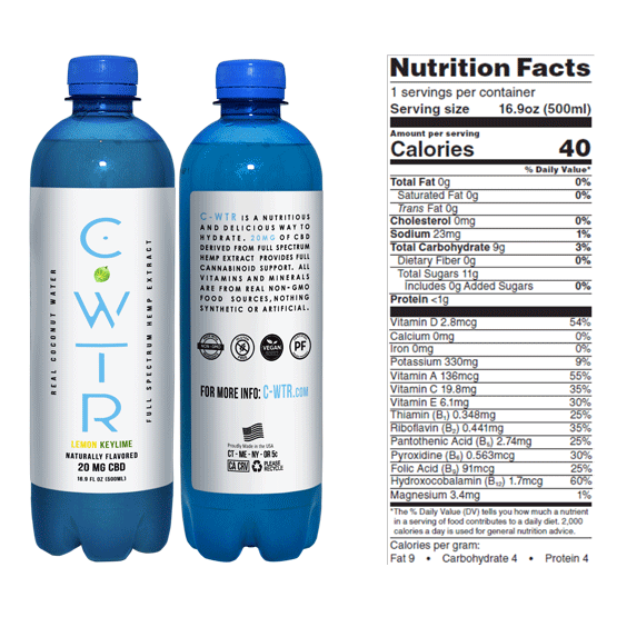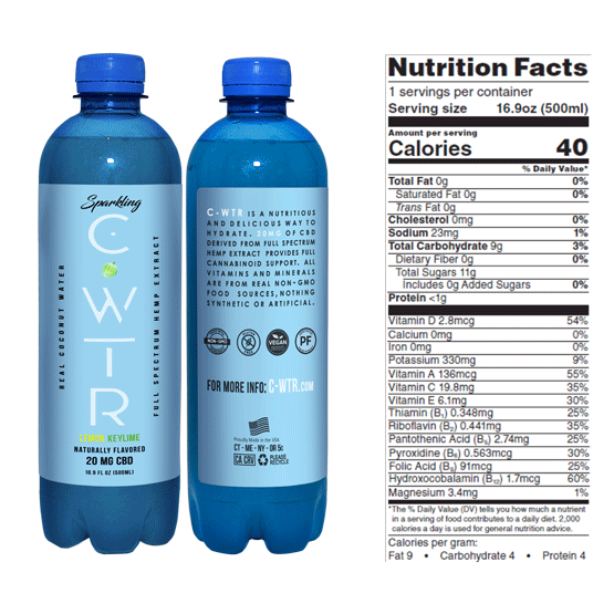 C-WTR is a natural, delicious and nutritious way to HYDRATE, RECOVER & ENERGIZE! Coconut Water provides the proper balance of electrolytes for Hydration. Every 16.9oz bottle of C-WTR is made with a Full Spectrum Hemp Extract that contains 20mg of CBD in addition to CBG, CBGa, CBC, CBN and all the essential oils or Terpenes found in Hemp. The Natural Fruits found in GrandFusion™ provide an abundance of essential vitamins and minerals refueling the body naturally with every sip.